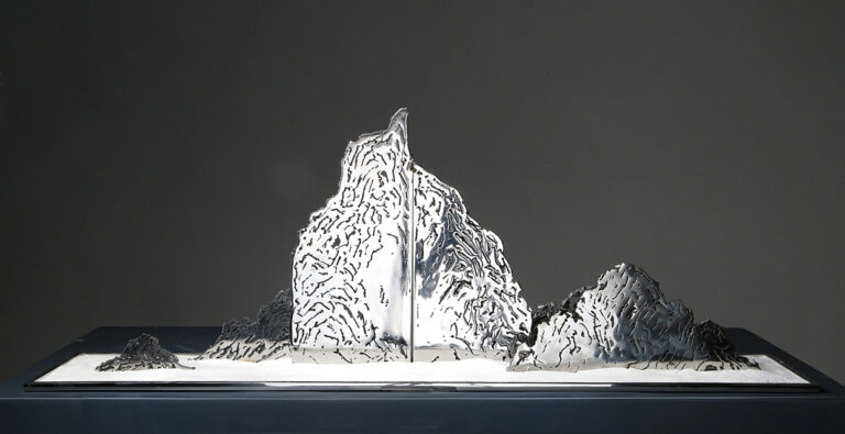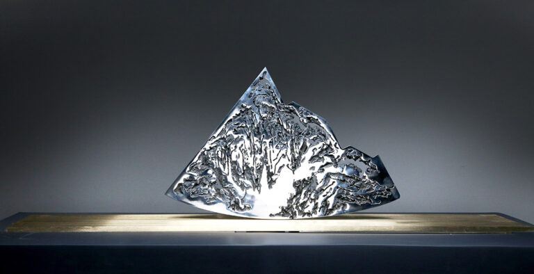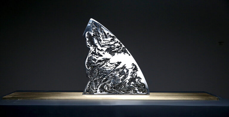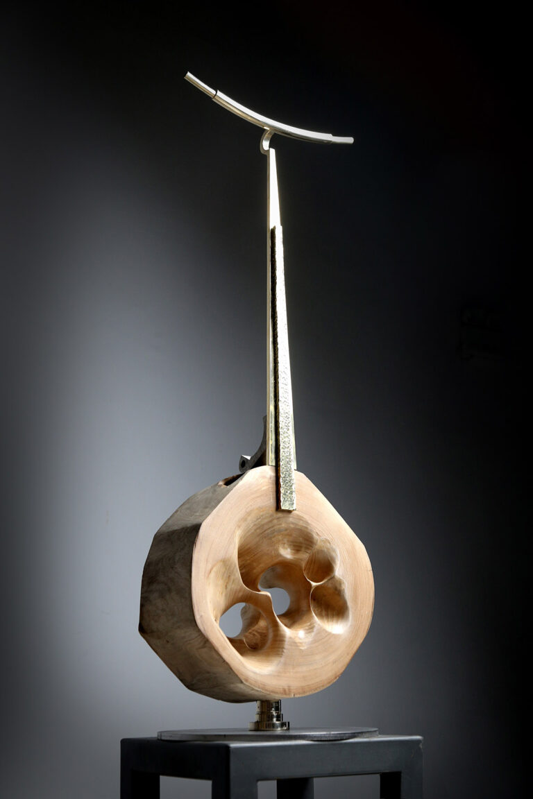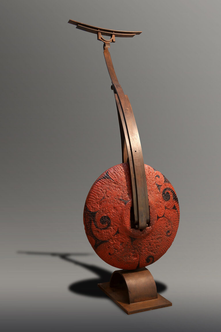 ” I have a lyre in my heart. My strong muscles and bones produce bold tones, while my multi-sensitive heart produces soft, gentle tones. I pick up parts left over from large industries and make lyres. The quiet melody is already ringing in my heart. I love these parts. Because these parts, covered in the dust of history, exhale the unique flavour of their time. Through those artefacts I meditate on the aesthetics of that era. The beauty of the industrial age still strikes us. I prefer its beauty to its rise and fall, like an old man recounting a moving scene. The sound of its spinning gears and various metal parts colliding with each other is like a grand symphony of the power of that era. I don’t know which part is my favourite part. It might be a small cog in a large ship, but it is what keeps the ship from being lost at sea. Or it could be part of a porthole where people used to lie on their backs and look out over the blue sea. These discarded parts blow my mind. The unique metal parts, which are a concentration of the greatness and wisdom of the creators of that era, make a cheerful and powerful sound that is a marvel to behold. They are irreversible metal parts that embody the dreams of many engineers. Moulds are made from blueprints of the time, and everything from minute gears to huge propellers are cast into three-dimensional models. They are hard but not inorganic like steel, and their parts, which are inhabited by the thoughts of the designers and the body warmth of the producers, are rigorous but not monotonous, with tens of millions of variations, giving the impression that the design style of industrial parts differs greatly from region to region. Different cultural backgrounds and different processing methods hide different aesthetic sensibilities. When the storm of the Industrial Revolution swept across the world, everything melted into and intertwined with the soil there, like dew in a desert. For me, it is important to keep in mind all the messy components. Because they were all sounds I was trying to play. I was on a mission to rework them into a work of art and sing the melodies of that era once more. I want to sing of the past and preserve its magnificent fragments. And I want to sing of the present and celebrate the return of the heroic spirit of today. In designing and combining them again and again, I discovered a beauty that must not be forgotten. Cold skeletons are transformed into soft curves, the wisdom of Western industry into the flavour of Eastern art. The process of recombination is like dew melting into the earth. This earth is nothing but a lyre in my heart. It is the medium through which I express the emotions of my life, the warmth and coldness of the world. As there is a lyre in everyone’s heart, we probably spend a lifetime searching for it and a lifetime playing it. The former shipyards of heavy industry have become a window to modern culture and hold many memories in people’s hearts. This sculpture is like an old sea lyre song playing in our hearts.”