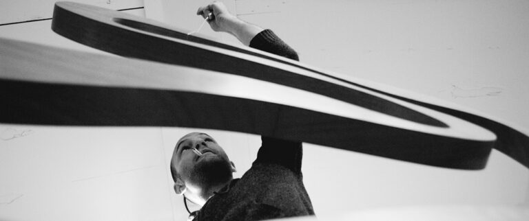Bings principle materials are wood, metal (iron, bronze and copper) paper and clay. He employs traditional Japanese wood bending and shaping techniques to achieve his forms. Bings work requires patience. Plywood volumes are spontaneously drawn in generous biomorphic gestures and then carefully cut out with specialized hand tools. They then undergo a transformation of form through a steaming and wood bending process that Bing describes as improvised techniques derived from both Japan and Czech Thonet chair making. The hot steam makes the wooden shapes pliable, they are then slowly pushed and drawn by hand into bold curves. What happens to these structures after they take on their new forms depends on how Bing feels about the ‘fresh life’ he discovers in the new body itself. Some shapes are painted on, drawn on and scraped back while others are simply left as they are because the inherent qualities of the wood express more than the application of any opaque colour could. On most works Bing uses a finishing technique brought by his architect grandfather from the Czechoslovakia to New Zealand – the application of organic shellac. This shellac is repeatedly applied on the steamed worked forms in multiple micro thin coats with layers of pigment and patina worked in-between, similar in many ways to traditional Chinese Lacquer techniques. The result, in Bings best works, is an object with the timbre and spirit of an old musical instrument, the fresh bold spring of organic modernism and the universality and simplicity of asymmetric geometry. Gidons print compositions and processes are influenced by Chinese and Japanese wood block print methods. They are also strongly informed by his sculptural and ceramic practice creating a great sense of continuity across his various mediums. Wood grains, copper and bronze foil, intricate Lino line work, pure white on white embossed impressions –individually and in various combinations comprise a rich palate of texture, form and colour. Bing’s range of ceramic homewares, like his Ltd edition vessels, and sculptures are designed and produced from a waterfront boatshed atelier and basement studios, and are sold and collected worldwide. These ceramic objects are hand made using techniques such as traditional Japanese wood bending, carving, plaster turning and mould making together with more contemporary approaches such as 3d printing and multi axis cnc. These processes form part of Bing’s unique sculptural approach to designing and producing ceramics. The latest collection of ceramic vessels draws inspiration from exploring the relationship between biological asymmetry and the artefact. Bing’s studio practice is currently working on several new collections due to launch in Australia, New Zealand and Asia, as well as commissions and collaborations with leading fashion labels and interior designers, as well as several large commissions for wooden and brass sculptures.