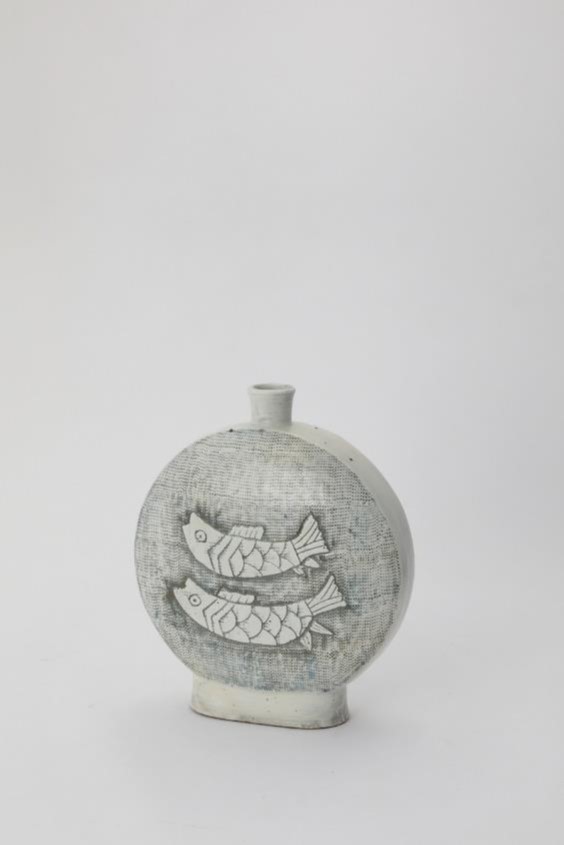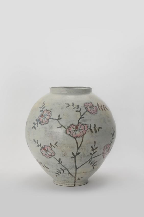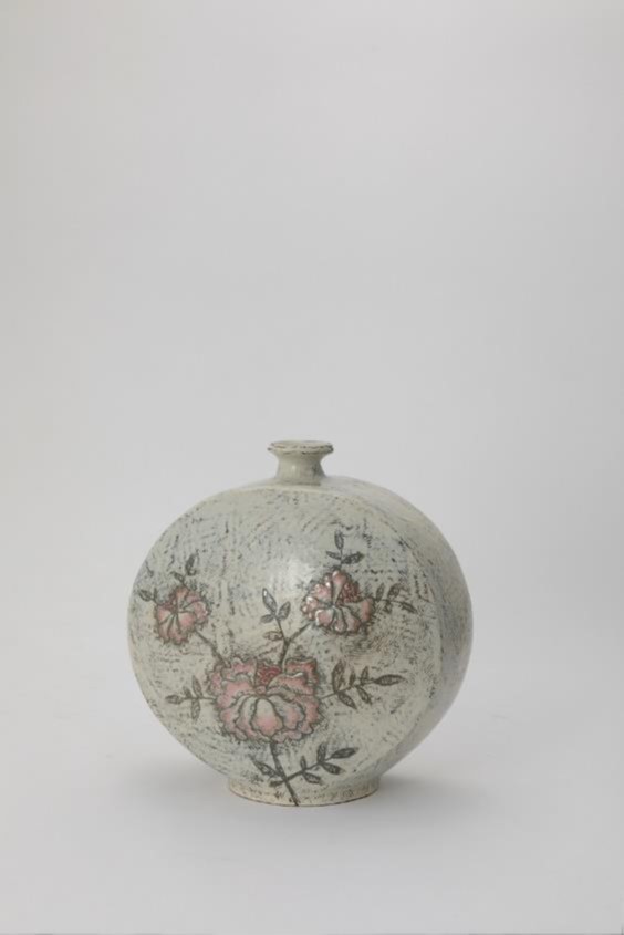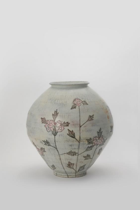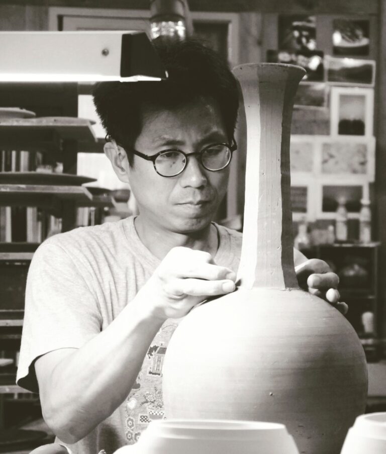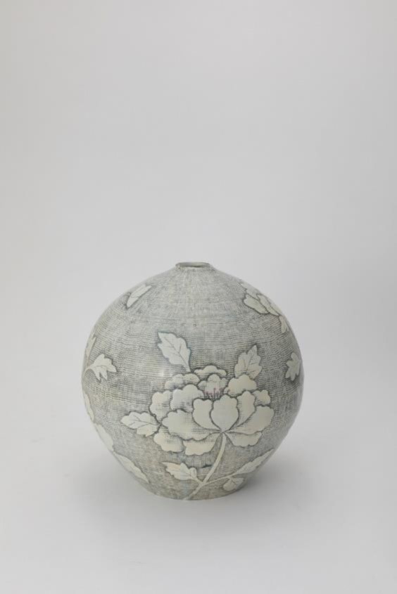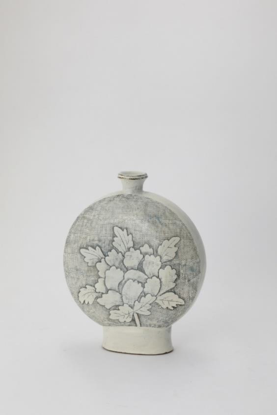 ” I use specific buncheong techniques that after I make a pattern on a jar repeatedly or irregularly and then fill it with slip.