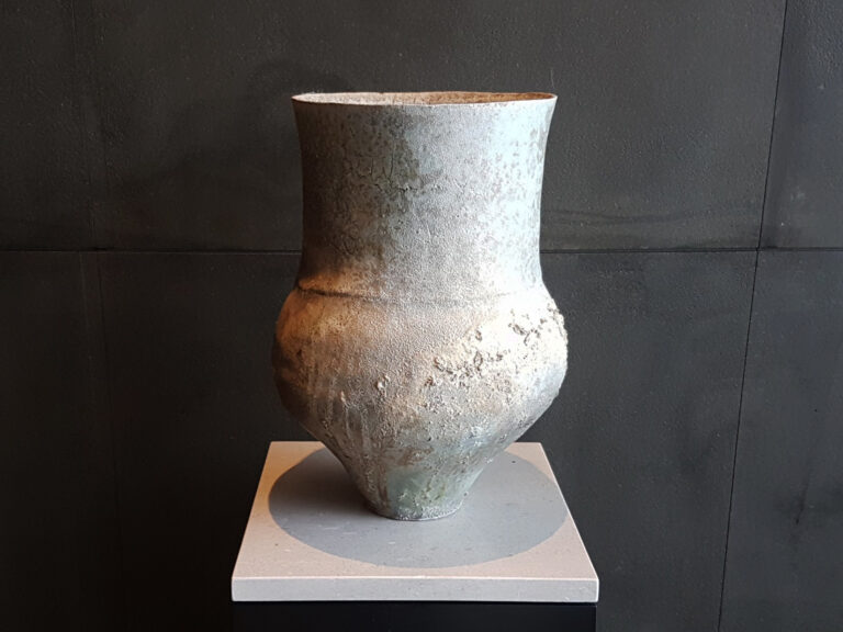 ” I have been familiar with calligraphy since I was a child and have been active mainly in holding solo exhibitions in that line. In 1990, I encountered ceramics. Every time I turned the potter’s wheel, I could feel the passion that welled up from my heart. When I started to manage to make ceramic works that I was satisfied with, I also realized that something was missing here and that there should be a way to express more of myself. Before long, there was naturally a “character” familiar to my body. This is how my original work was born. Currently, I am focusing on creating works that fuse calligraphy and ceramics.